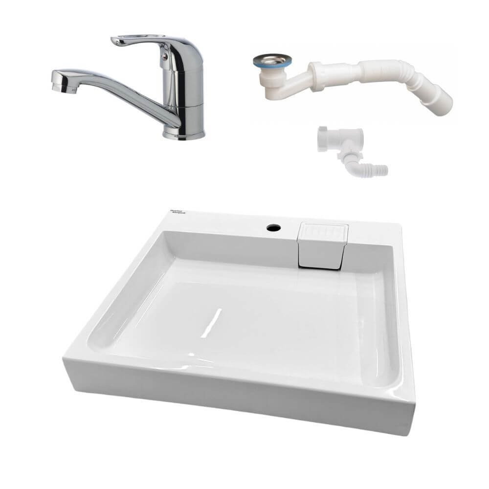 - Комплектація: умивальник, комплект кріплень, сифон (опціонально), відвод води для пральної машини (опціонально), змішувач (опціонально)